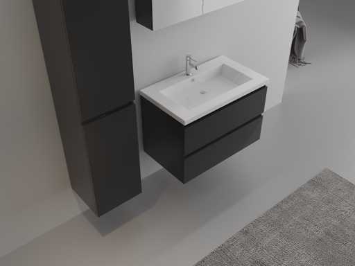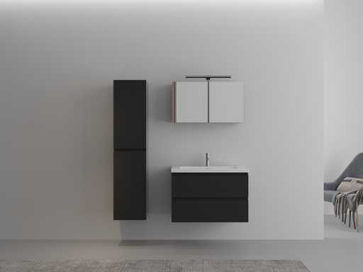 Ausgestattet mit: Wasserhahn inklusive Klappabfluss – 2 Schubladen – Softclose-System an Türen und Schubladen – Harzspülbecken – LED-Beleuchtung über dem Spiegel – Spiegelschrank mit 2 Türen und 1 Regal – Vormontierte Seitenschränke und Waschbecken.