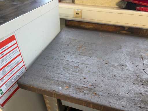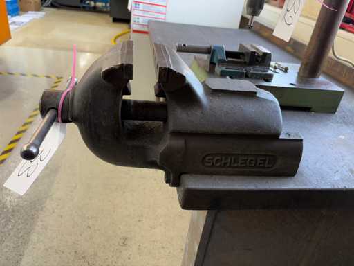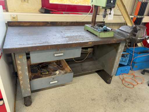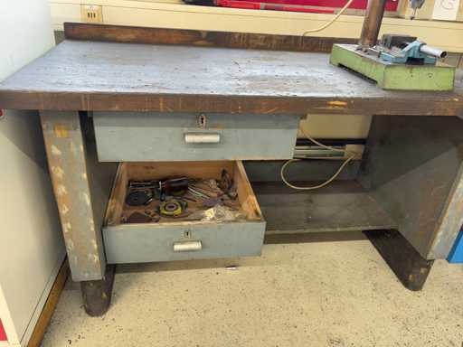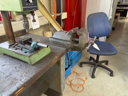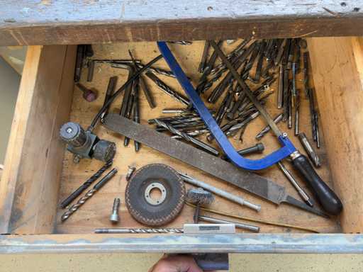 Inhalt bestehend aus einem aufgesetzten Schraubstock (Backenbreite: 125 mm), diversen Bohrern und Handwerkzeugen