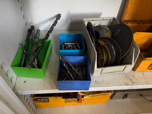 Inhalt bestehend aus diversen Handgeräten wie Bohrmaschinen, Schleifgeräten, Schleifscheiben, Spiralbohrern