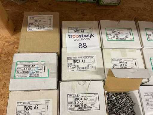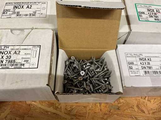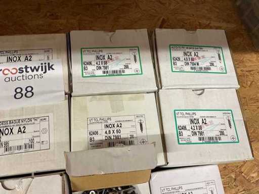 12 Kisten mit Edelstahlschrauben und Schrauben aus Holz