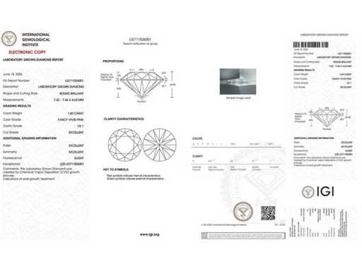 Form: Runder Brillant Gewicht: 1,60 CT Farbe: Fancy Visted Pink Helligkeit: VS1 Symmetrie: ausgezeichnet Fluoreszenz: Licht Laserinschrift IGI: LG711526001 Besichtigung nach Vereinbarung