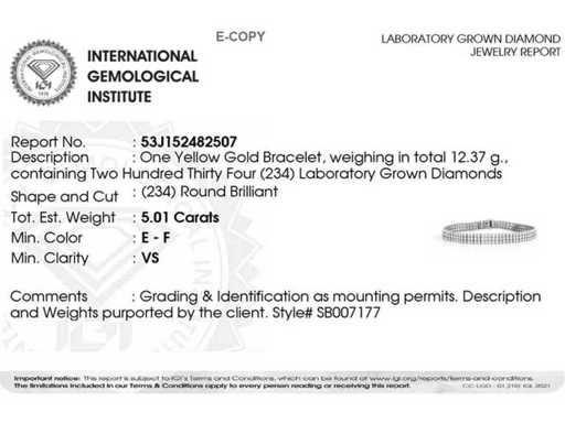 Anzahl der Gegenstände – 1, Metall – Gold, Gesamtgewicht – 12,37, Gesetzt mit im Labor gezüchtetem Diamanten, Anzahl der Diamanten: 234, Gesamtgewicht Karat: 5,01, Diamanten Klarheit: VS, Diamantform/Schliff: Rund Brillant, Diamanten Farbe: EF, Zustand: Neu, Größe 18 cm, Goldreinheit am Schmuckstück, Designcode: 8536-SB007177, Verpackung: Schmuckschatulle, IGI-Zertifikat enthalten, Historischer Verkaufspreis: 7745 €, Alle unsere Chargen werden in Fedex-Boxen mit hoher Priorität verschickt. Sie wird in der Regel innerhalb von 7-14 Tagen verschickt und die Lieferung erfolgt danach innerhalb von 24-48 Stunden. Die Grundstücke sind vom Verkäufer versichert und im Voraus bezahlt.