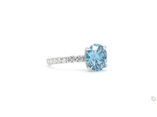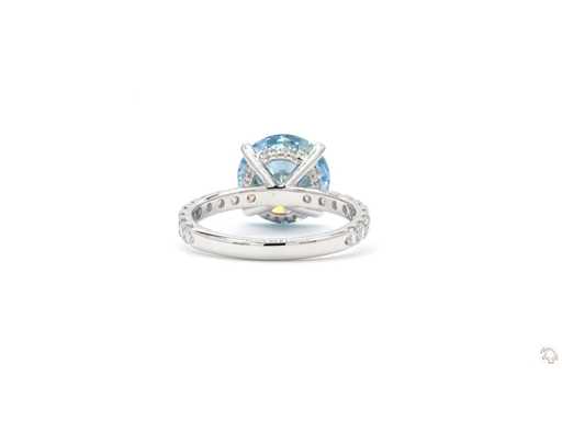 Exklusiver 18-Karat-Weißgoldring Ringgröße – 53 EU IGI-Berichtsnummer: LG731581491 Form: Rund, wunderschön Gewicht des Hauptsteins: 4,02 Karat Farbe: Schicken leuchtendes Blau Helligkeit: VS1 Symmetrie: ausgezeichnet Umgebender Stein – 0,71 Karat (34 Stück) Gesamtgewicht des Ringes: 3,45 Gramm Besichtigung nach Vereinbarung