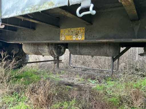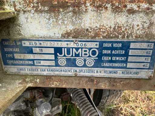 Ausgestattet mit: Luftfederung und hydraulischen Bremsen, ist der JUMBO TV 280 V eine gezogene Sandyacht mit Sandabdeckungsachse (Vorderachse) und Hinterachse, Ladefläche ca. 7,5–8,0 m, Innenbreite ca. 2,45 m, Innenhöhe ca. 2,60–2,70 m, ausgestattet mit Planenkarosserie, mechanischen Bremsen, Schleppkupplung, zulässiger Achslast vorne ca. 9.000 kg und hinten ca. 18.000 kg (laut Bild), vorgesehen für landwirtschaftlichen und inneren Transport.
