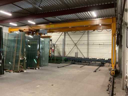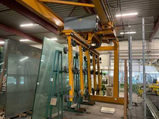 Weitere Spezifikationen: Krangeschwindigkeit: 60 m/min Kolbenbrücke: 40 m/min Leistung: 14 kW Arbeitsdruck: 6 bar Mit Wiegefunktion (1x) Kolbenbrücke (SBL): Vakuumkolbenbrücke für Glasaufnahme Geeignet für Jumbo-Glasplatten Maximale Glasscheibengröße: 6000 x 3250 mm Glasdicke: 3 – 12 mm Positionsgeschwindigkeit: ca. 2 – 3 m/min (1x) Tisch / Unterstützungsstation, Typ: ATL-60/30BF Baujahr: 1994 Seriennummer: 141.30.50.23 1294 Gewicht: 2150 kg Verbindung: 400 V Arbeitsdruck: 6 bar