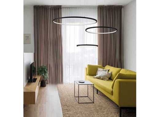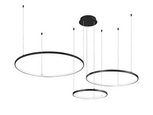 Solo Senti 360 Design Leuchte in Schwarz, geeignet für Empfangsräume, Versammlungsräume, Arbeitsräume oder den Ausstellungsraum, aber auch im Wohnzimmer, Loft oder anderen Wohn- und Arbeitsbereichen. Besteht aus 3 separaten rotierenden und kippbaren Ringen, die mit einer warmweißen Opal-LED-Lichtquelle ausgestattet sind. Dank der flexiblen Höhenverstellung ist es möglich, die Ringe schnell und einfach separat zu neigen oder anzupassen. Abmessungen pro Stück ca.: 80 cm / 60 cm / 40 cm Cardan verstellbar: Ja. Lichtstrahl etwa 110 Grad. Helle Farbe: Warmes Weiß. Verbindung: 230 Volt. Farbe: Schwarz matt Grundstückswert: 696,€