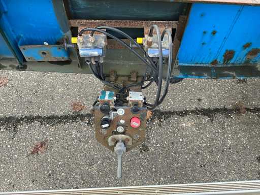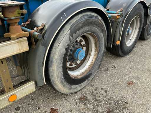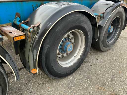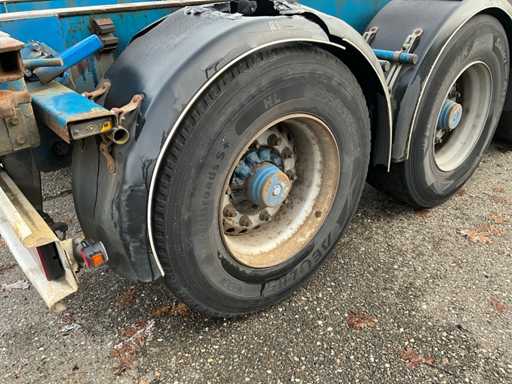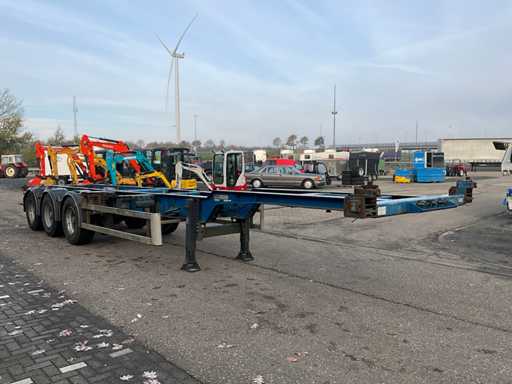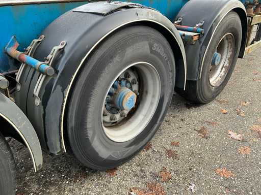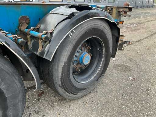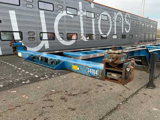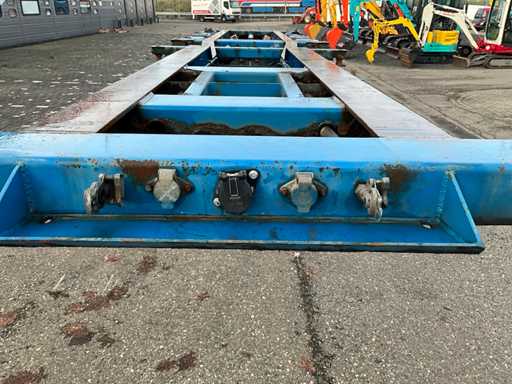 Containerfahrgestell mit landwirtschaftlicher Zulassung, maximale Masse 39.000 kg, geeignet für Container von 45 Fuß, 40 Fuß, 30 Fuß und 2x 20 Fuß, pneumatisch ausziehbares Heck, Luftfederung, luftgebremst, 3x 9T-Achse, Vorder- und Hinterachse, 24V-Beleuchtung
