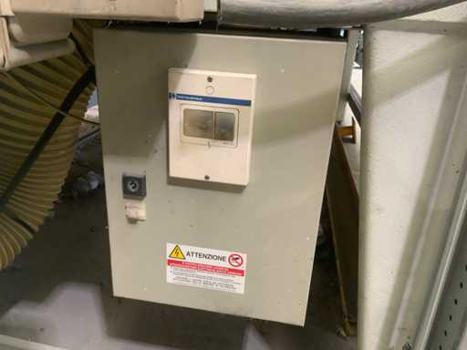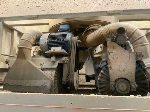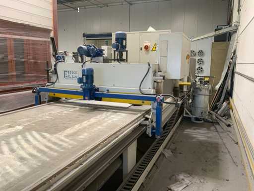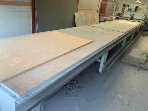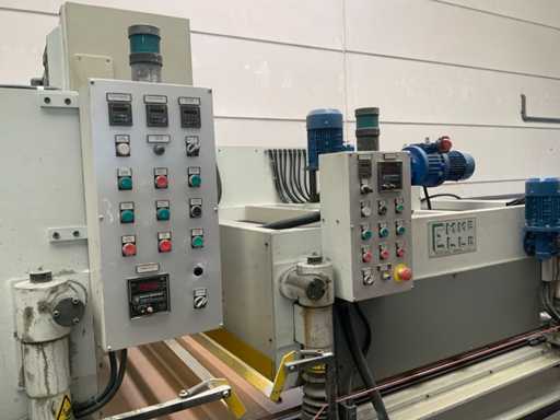 Verarbeitungsart: Hochglanz/Polierung für Holz- oder Holzplatten * ausgestattet mit automatischem Antrieb und Positionierungsteil * ausgestattet mit Vakuumtisch * Arbeitslänge: ca. 3.200 mm * maximale Durchgangshöhe: ca. 320 mm * Tischlänge 12,5 Meter * 4 Poliert-Baumwollrollen Ø 350 mm * ausgestattet mit Auszug * ausgestattet mit Steuerkasten * ausgestattet mit Sicherheitsleitungen / Sicherungssicherung für Zugseilschalter * Gesamtlänge ca. 15,5 Meter