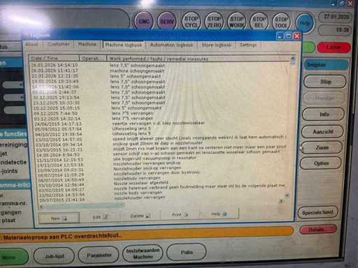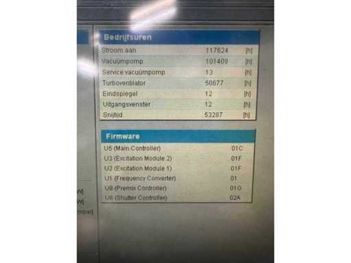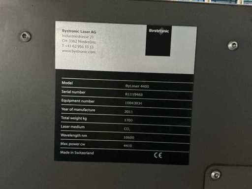 Ausgestattet mit: CNC-Steuerung, Kühlinstallation (EF-Kühlung, WKL 430, Baujahr: 2011, Leistung: 22 kW, maximaler Druck: 29 Bar), Absaugsystem (Donaldson, DFPRO 6-SPRK, Leistung: 5,5 kW, Baujahr: 2011, Gewicht: 1100 kg), 2x Stahl-Schneidgitter, 2x Edelstahl-Schneidgitter, verschiedene Transportausrüstung, Ersatzteile, nachweislich bekannte vollständige Wartungshistorie, Lens-Kassettenwechseler für 4 Kassetten (3,75" 5" 7,5").