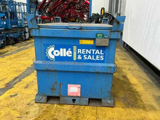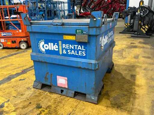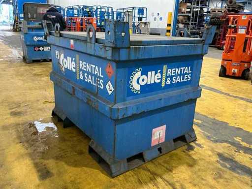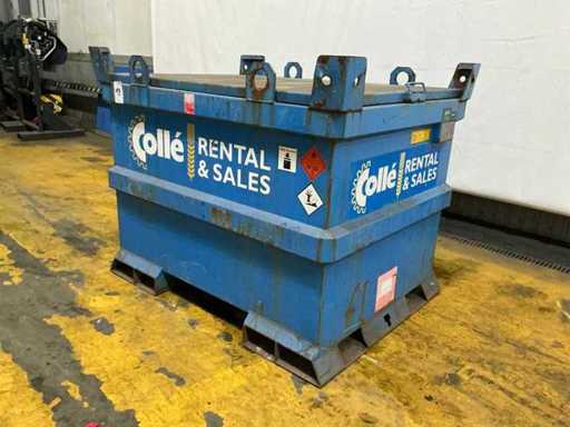 Ausgestattet mit Gabelstaplerschlitzen und Hebeaugern; stapelbar; 1x manuell betriebene Dieselpumpe; Schlauch mit Ladepistole.