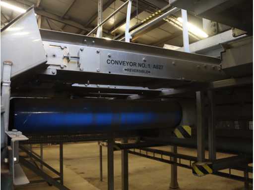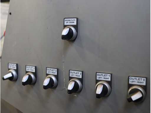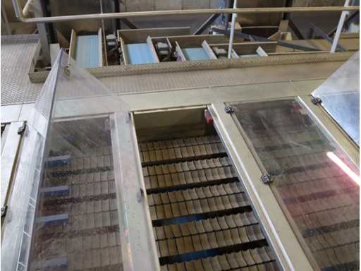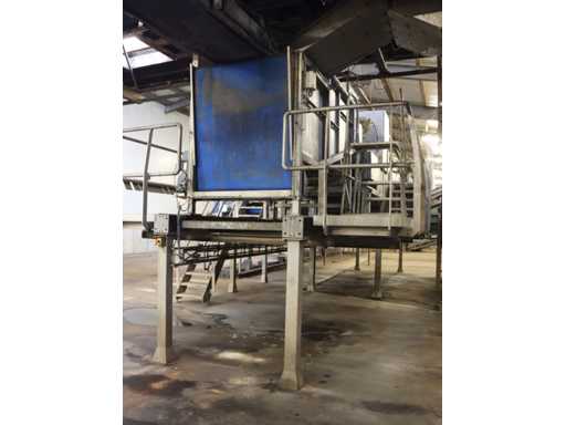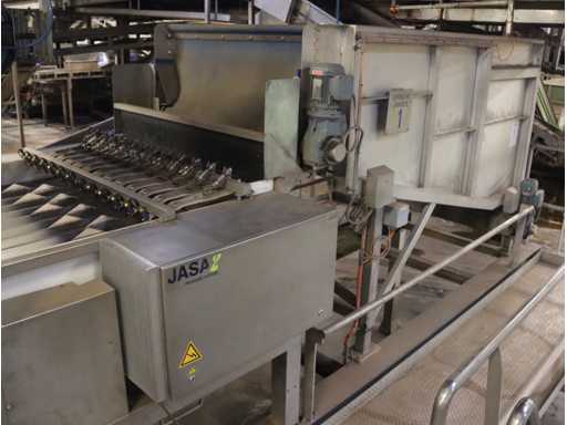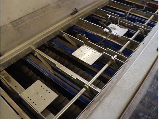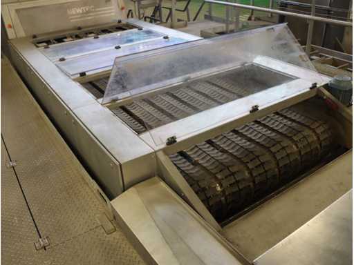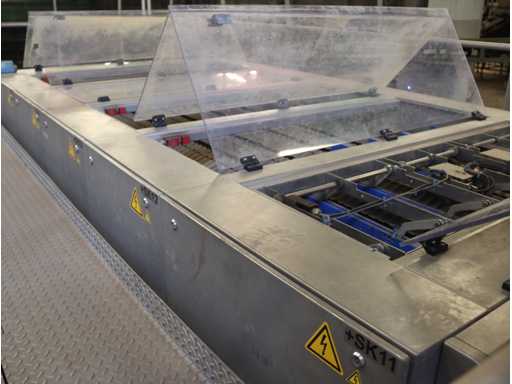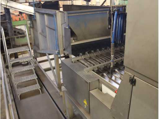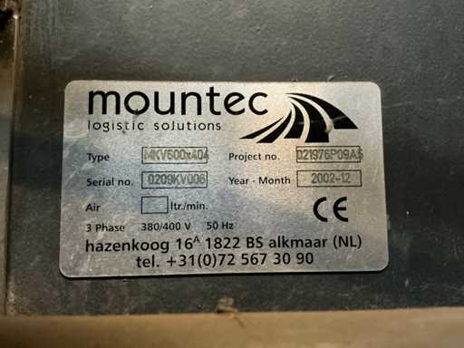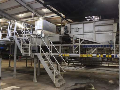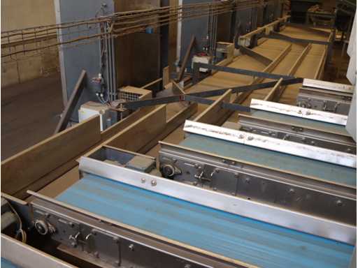 Ausgestattet mit Eingangsbunker mit Förderband, 12 Zuführschächten mit optischem Sensor, Inspektionseinheit mit Touchscreen-Bedienung, 6 Doppelleitungs-Förderbändern mit kontinuierlicher Ausgangssortierung, 5 unterlaufende Querförderbänder (in verschiedenen Längen), Unterlaufförderband mit Alleenaufteilung (Größe ca. 11000x1200 mm), 5 "Mountech"-Ausgabeeinheiten mit Bin-Abholung, Typ MKV600x402 (2002), genutzte Bodenfläche ca. 19000x6000 mm (Demontage auf Anweisung für Troostwijk)