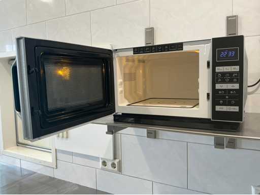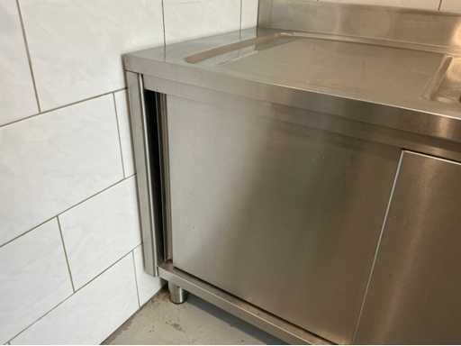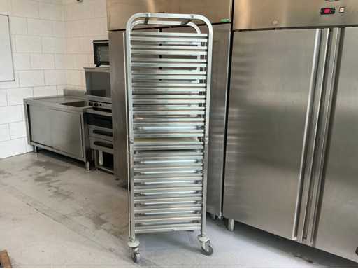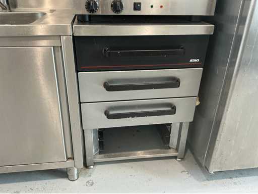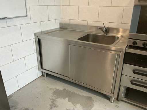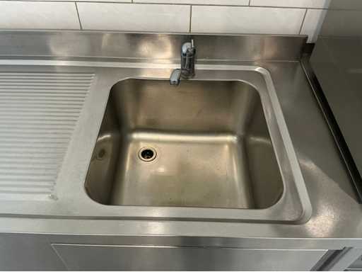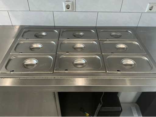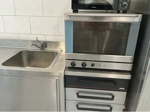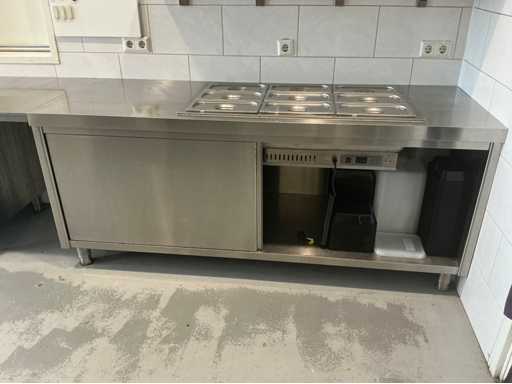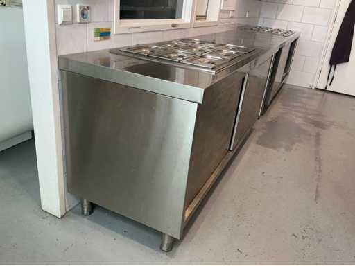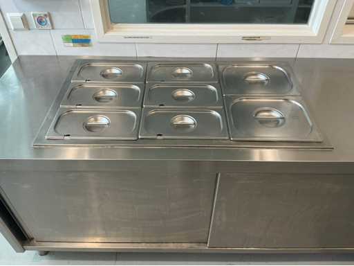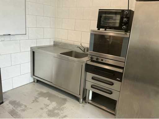 Bestehend aus Spüle 140x70mm, Mastercool Kühlschrank 140x203x80mm, Gefrierschrank 131x 205x 81mm, 2x Au Bain Marie Tische 2000x70x88 mm mit Behältern von 320mm, Sharp Mikrowelle 2x, Blokker Backofen, Regal, Regalwagen mit Catering-Behältern. Alles ist von 2017.