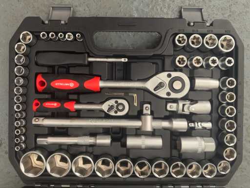 Ausgestattet mit 1/4" Steckdosen 4-4,5-5-5,5-6-7-8-9-10-11-12-13-14mm; 1/4" lange Fassungen 6-7-8-9-10-11-12-13mm; 1/4" Torx-Steckdosen E4-E5-E6-E7-E8; 1/4" Inbus-Stecknuss auf 3-4-5-6mm; 1/4" Philips auf der Kappe PH.1-PH.2; 1/4" Pozidriv auf Kappe PZ.1-PZ.2