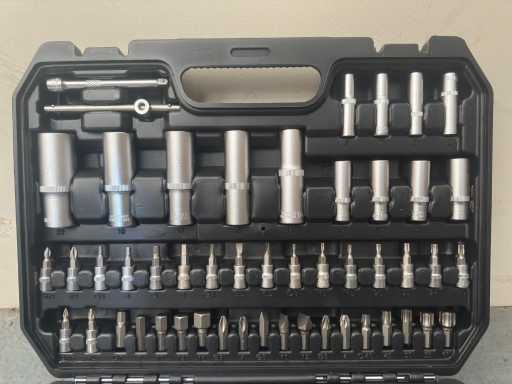 1/4" Flachbohrer im Stecksack 4-5,5-6,5 mm; 1/4" Torx am Sockel T8-T10-T15-T20-T25-T27-T30; 1/4" Ratsche 72 Zähne Schnellverschluss; 1/4" Verlängerungen 50-100 mm; 1/4" Kniegelenk; 1/4'' T Hebel; 1/4" Spinner; 1/2"-Steckschlüssel: 10-11-12-13-14-15-16-17-18-19-20-21-22-24-27-30-32mm; 1/2" lange Fassungen 14-15-17-19-22mm; 1/2" Torx-Sockeln E10-E11-E12-E14-E16-E18-E20-E24; 1/2" Unbus-Bits 7-8-10-12-14mm; 1/2" Philips-Bits PH.3-PH.4; 1/2" Pozidriv-Bits PZ.3-PZ.4; 1/2" flache Bohrer 8-10-12 mm; 1/2" Torx-Bits T40-T45-T50-T55-T60; 1/2" Bithalter; 1/2" Ratsche 72 Zähne Schnellverschluss; 1/2" Verlängerungen 125–250 mm; 1/2" Zündkerzensteckdosen 16-21mm; 1/2" Kniegelenk; Inbus-L-Schraubenschlüssel 1,5-2-2,5 mm; Unbenutzt in der Box (Transportgröße 380 x 80 x 290, Gewicht 6,52 kg)