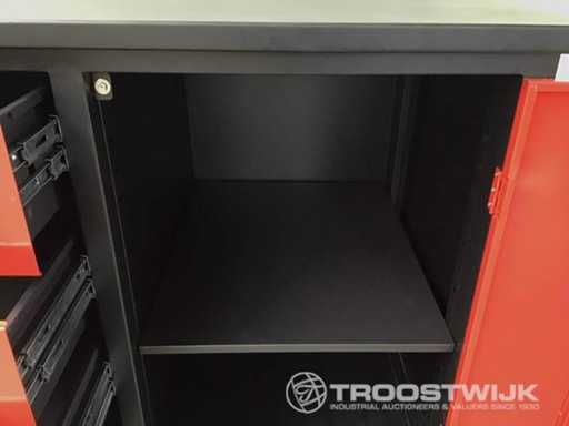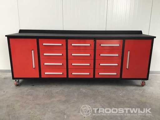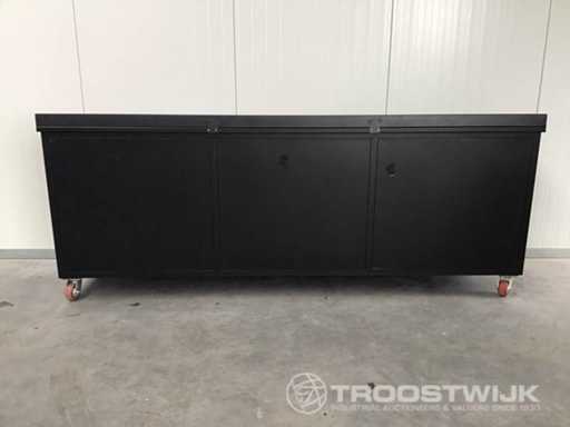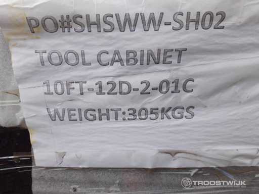 ausgestattet mit 2x Schlüssel; 2x Aufhängebügel; 12 Schubladen; 2x Staufach; 3-teiliges Schiebesystem; rutschfeste Matte; Räder; seitlicher Griff; Gesamtmaße LxBxH: 2870x720x1140; Eigengewicht: 305 kg; © unbenutzt.