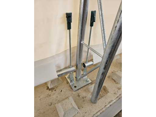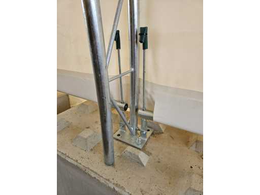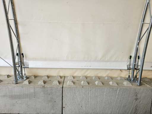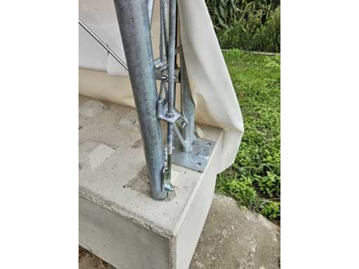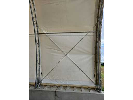 Freier Spannweite von 10.000 mm; Abteilgröße 2500 mm; insgesamt 8 Abteile zu je 2500 mm; Grathöhe 5000 mm; Ganzblech verzinkte Konstruktion; ungenutzte Konstruktion mit neuem Segel; komplett mit Druck und Zugstangen; Bodenplatten und Kleingeräte; wird vom Verkäufer ordentlich verpackt; ohne Betonblöcke;