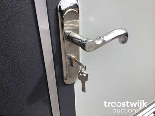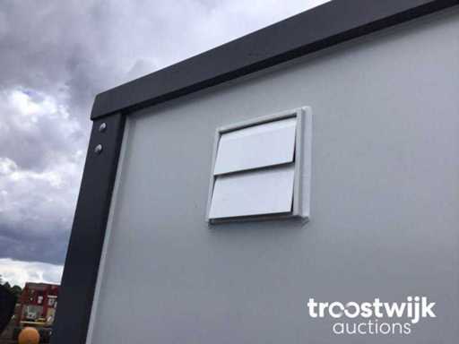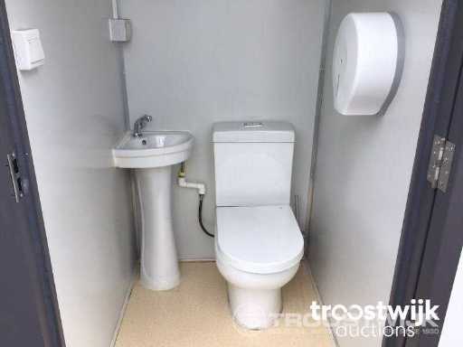 ausgestattet mit Toilette und Waschbecken; Toilettenbürste; Toilettenpapierhalter; 220-Volt-Verbindung; abschließbar mit Schlüssel- und Knopfzylinder; Löffellöcher; Augen zu heben; © ungenutzt