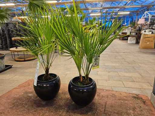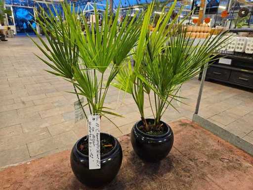 Bring Mediterranean flair to your outdoor area with this exclusive set of two Chamaerops humilis (European Fan Palms). These robust palms impress with their fan-shaped, deep green fronds and compact growth. They are particularly easy to care for and can withstand temperatures down to -12°C, making them the ideal choice for terraces, balconies, or entrances. They come in elegant, glossy black ceramic pots that perfectly showcase the plants.