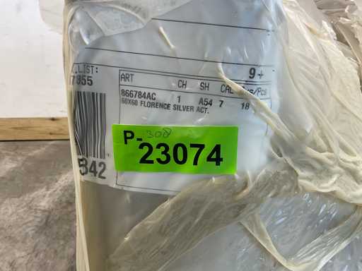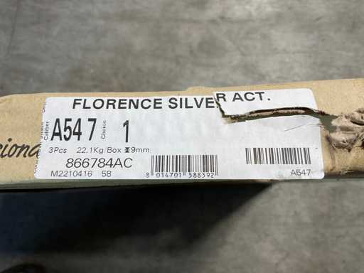 Keramikfliesen der Marke Iris Ceramica, Typ Florenz, in der Farbe Silber. Diese Fliesen eignen sich für Boden- und Wandanwendungen und haben eine Größe von 60 x 60 cm bei einer Stärke von 9 mm. Es gibt 3 Fliesen pro Packung, gut für eine Fläche von 1,08 m².