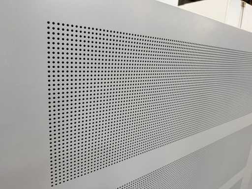 Massiver niedrigmetalliger Aktenschrank in hellgrauer Version, ausgestattet mit perforierten Schiebetüren für optimale Belüftung. Der Schrank ist mit mehreren verstellbaren Regalen ausgestattet und eignet sich zur Aufbewahrung von Akten, Materialien oder technischen Komponenten. Ideal für Büro-, Archiv-, Werkstatt- oder IT-Umgebungen.
