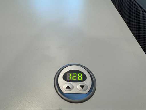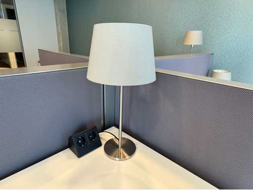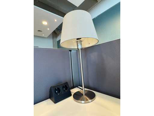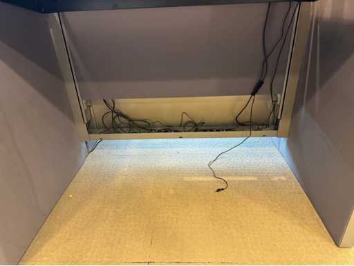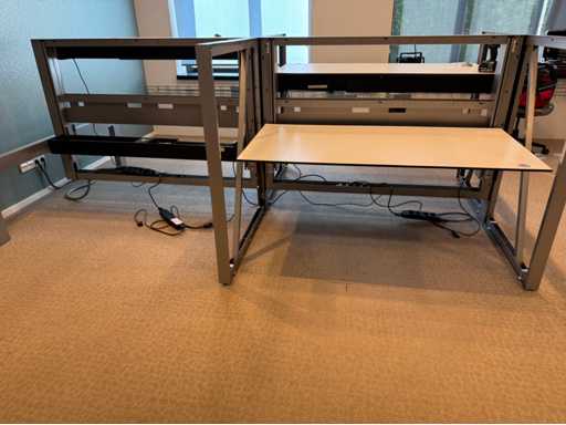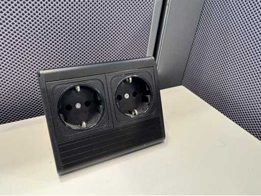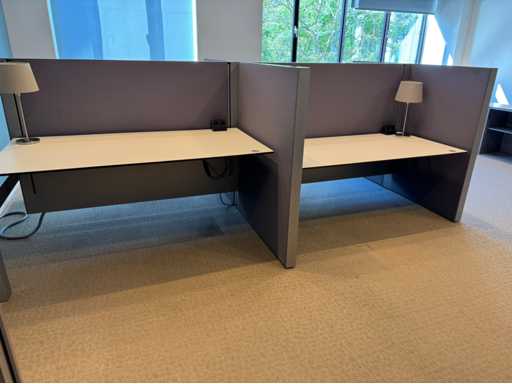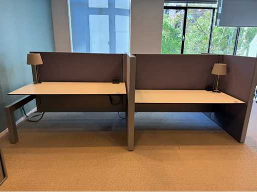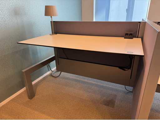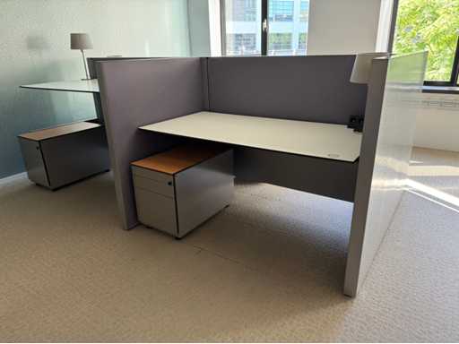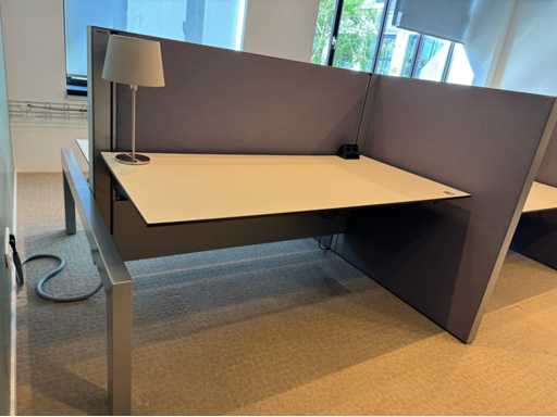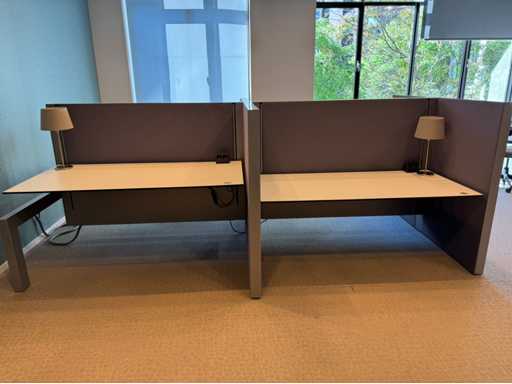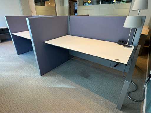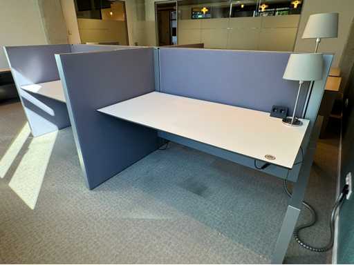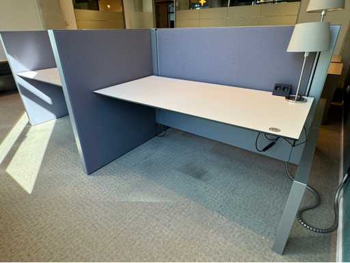 Bestehend aus 4 einzeln elektrisch höhenverstellbaren Sitz-Steh-Schreibtischen, mit einer schwimmenden Oberflächegröße von ca. 160x80 cm, ausgestattet mit akustischen Sichtschutzgittern, 4 LED-Lampen und Kontaktpunkten