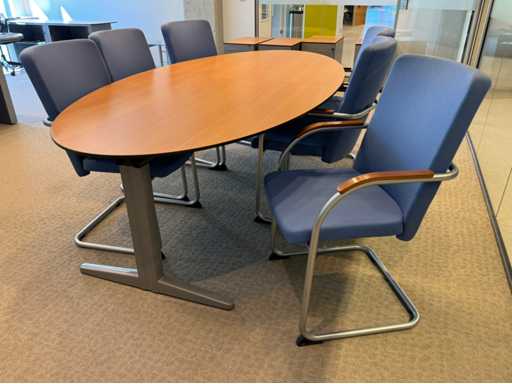 Bestehend aus ovalförmigem zweiteiligen Konferenztisch, 6-teiligen Lande-Konferenzstühlen mit Armlehnen, gepolsterter Polsterung und Schlittenfuß