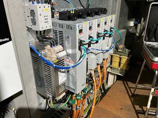 Allen‑Bradley Kinetix Mehrachsen‑Servoantriebssystem, bestehend aus gemeinsamer AC/DC‑Busversorgung (Bulletin 2198, 3~ 380–480 V AC, ca. 53–63 A, Ausgang 324–747 V DC, 69,2 A DC kontinuierlich / 207,6 A peak), mehreren Kinetix‑Servoantriebsmodulen (siehe Typenschilder auf den Modulen) sowie Netzfilter Bulletin 2190 DB80‑F, 3‑ph, 80 A;