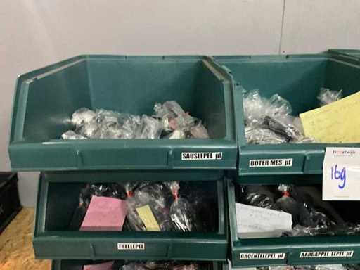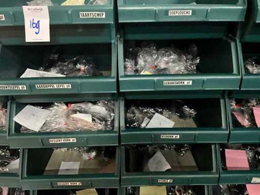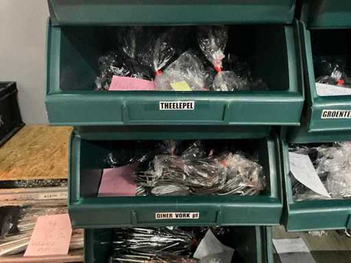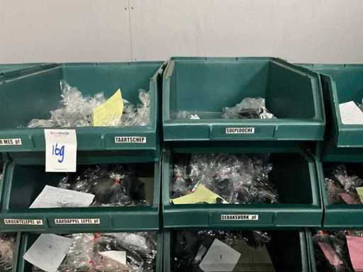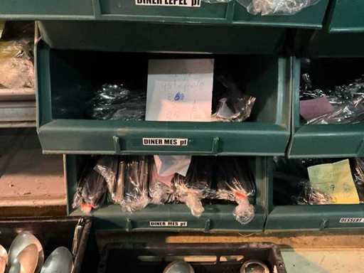 Bestehend aus 1600x Teelöffel, 225x Cocktailmesser, 1250x Cocktaillöffel, 1450x Cocktailgabel, 1275x Essmesser, 450x Dinnergabel, 10150x Dinnerlöffel, 12, 75x Dessertgabel und 1275x Wüstenmesser. 21 Plastikbehälter.