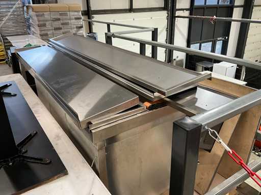 Edelstahl; ausgestattet mit einem Türrahmenschrank; 2x 3 Schubladen; 6x verschiedene Edelstahlregale einschließlich Hänger;
