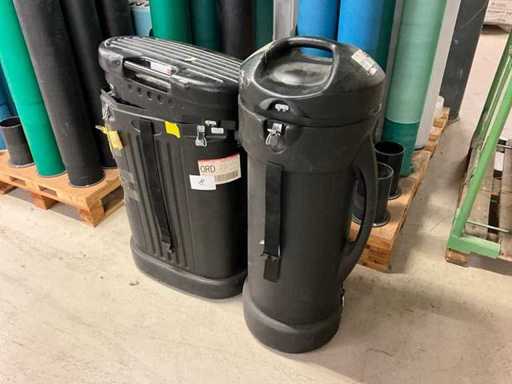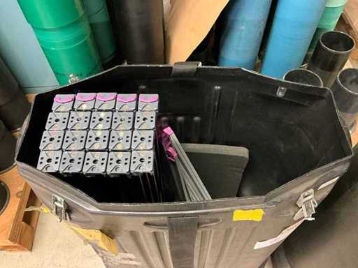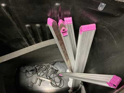 Pop‑Up Messewand / Falt‑Display, violett eloxiertes Aluminium‑Gestell, inkl. 2 Transport‑Rollcases aus Kunststoff, gebrauchter Zustand, ohne Grafikpaneele, ideal für Messe‑ und Promotion‑Einsätze, schnell auf- und abbaubar