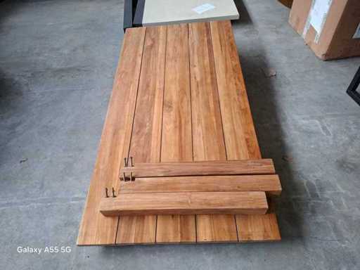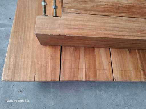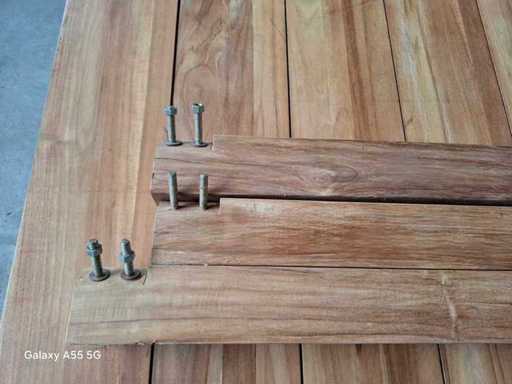 Dieser Gartentisch aus Ayra-Teakholz besteht aus Ayra Old Teak, indonesischem unbehandeltem Teakholz. Der Tisch misst 160x90 cm, 8 cm dicke Beine, 15 cm breite Regale und 3 cm dicke Oberfläche.