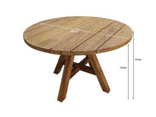 Dieser Gartentisch aus Ayra-Teakholz besteht aus Ayra Old Teak, indonesischem unbehandeltem Teakholz. Der Tisch hat eine Größe von 150 cm rund und eine 3 cm dicke Oberfläche. Der Tisch hat eine vierbeinige Basis, sodass man bequem am Tisch sitzen kann. Der Holztisch wirkt robust aus!