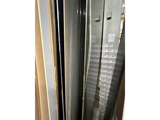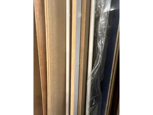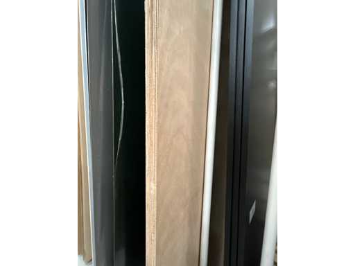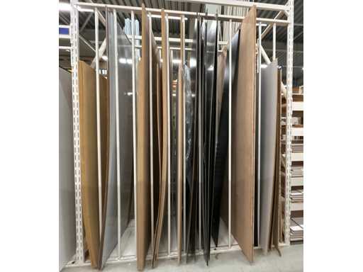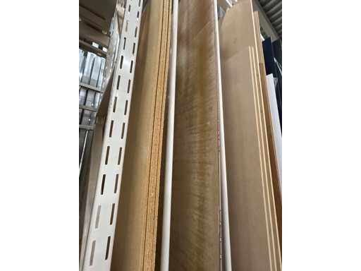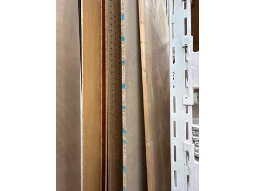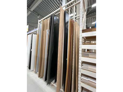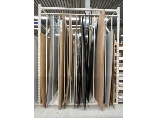 Inhalt des Regals: 43x verschiedene Platten, bestehend aus: Softboard 244x122CM, Lackplatte 305CM, MDF 305x122CM 22MM, MDF 305x122CM 9MM, MDF Lackträger, 10x Trespa 305x122CM, 2x wasserdichtes Sperrholz 305x122CM 18MM usw.
