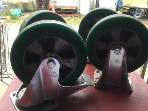Robuster Radsatz; bestehend aus: 4 gebremsten Rollen; 4 feste Räder; spurlose, elastische Gummireifen; Montage auf Platte; im Behälter;