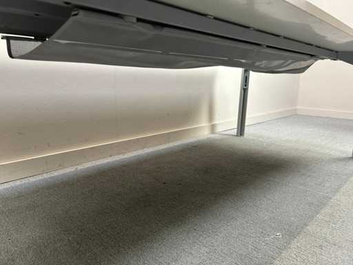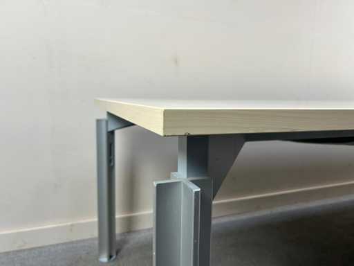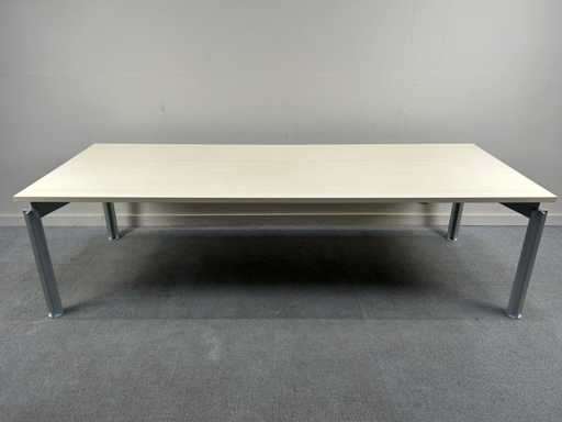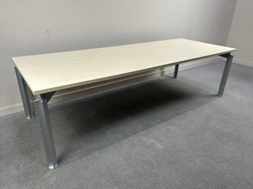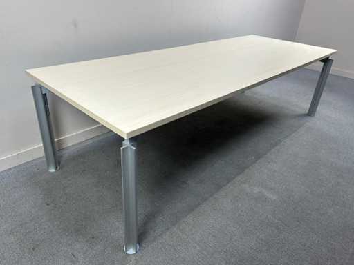 Bulo-Konferenztisch mit einer cremefarbenen Tischplatte (270x80) und einem stabilen Metall-Vierbein-Sockel, manuell einstellbare Höhe von 72 bis 82 cm