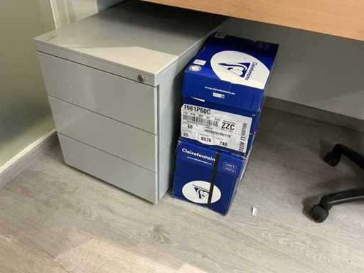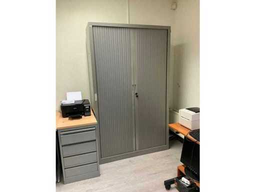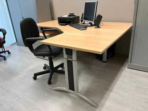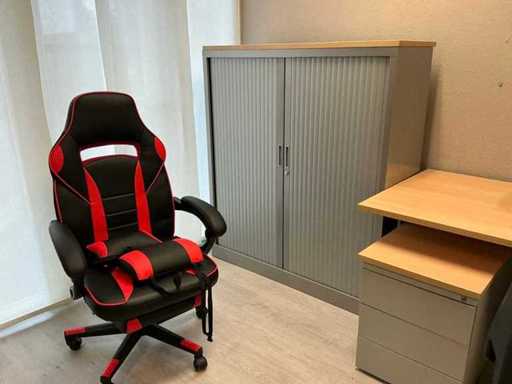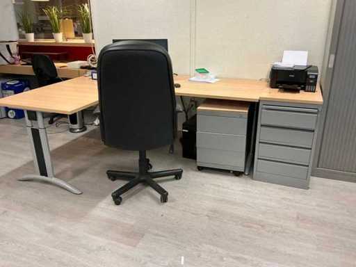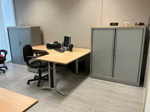 Bestehend aus 2 x Eckschreibtischgrößen von etwa 200 x 160 cm, 4 verschiedenen Schubladeneinheiten, 2x mittel- bis hohem Rollladenschrank, 1 Markant-Aktenschrank, 3 x Bürostuhl, außer Computern, Druckern sowie einigen IT-, Buchhaltungs- und Verwaltungsaufgaben