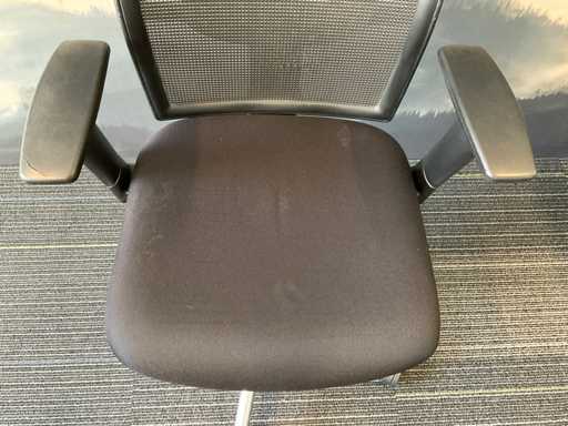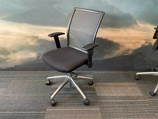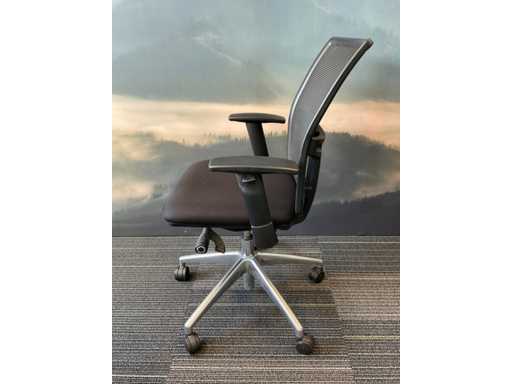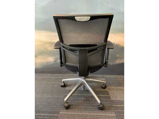 Verfügt über höhenverstellbare Armlehnen, Netzgewebte Rückenlehne mit Lendenstütze, schwarz gepolsterter Sitz und Stahlbasis
