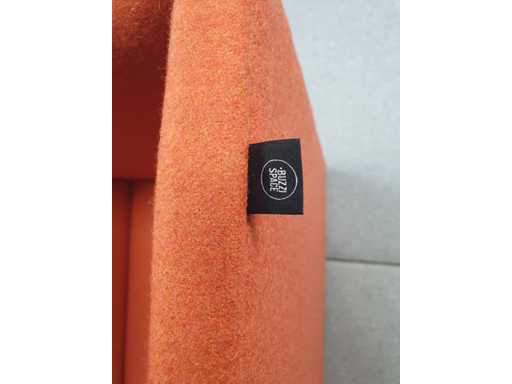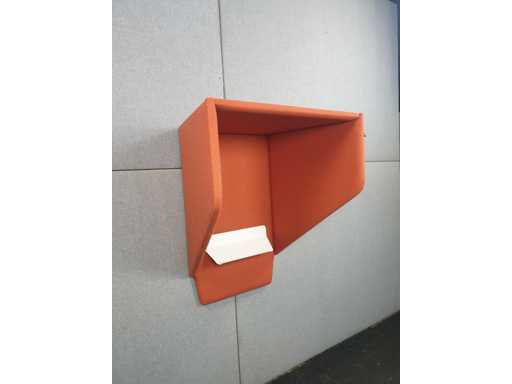 Akustische Telefonzelle von BuzziSpace, gestaltet als kompakter Fokuspunkt. Hergestellt aus einer warmen orangefarbenen Polsterung mit hoher Schallabsorption. Ausgestattet mit einem integrierten weißen Tablet/Regal, ideal für Laptop oder Notizen. Perfekt für offene Büroumgebungen, Bibliotheken oder Co-Working-Spaces.