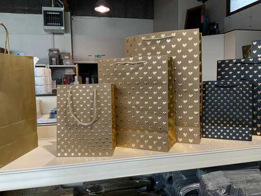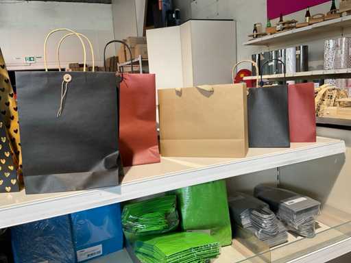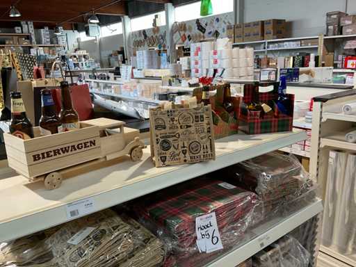 Bestehend aus verschiedenen Arten und Größen von Papier-Tragetaschen, Bierbeuteln, Biertabletts, Pappbierkörben und Holz-Bierwagen. Ohne Rack.