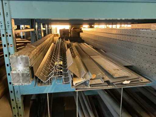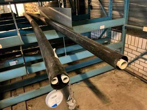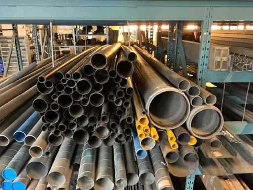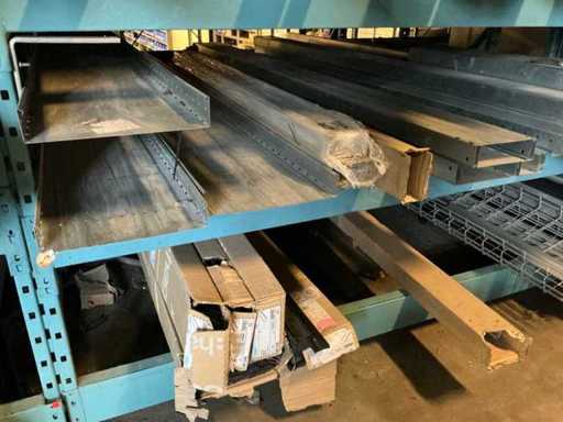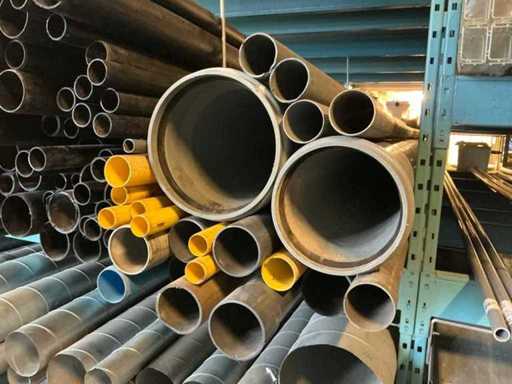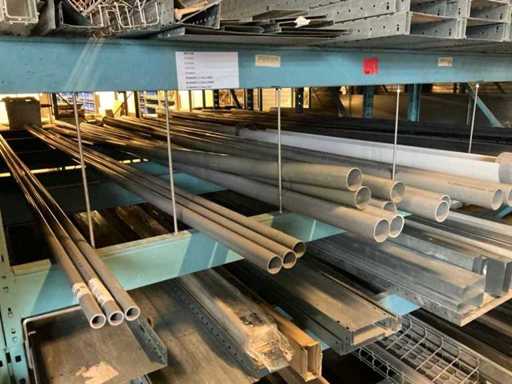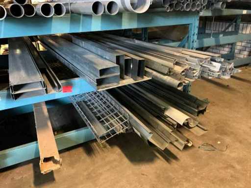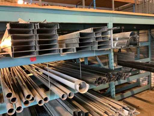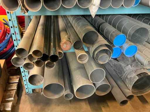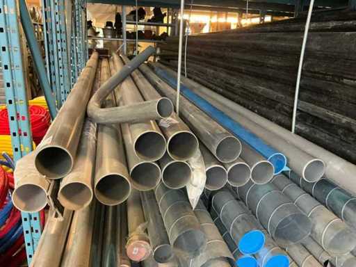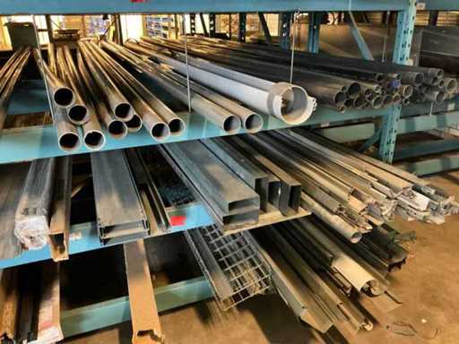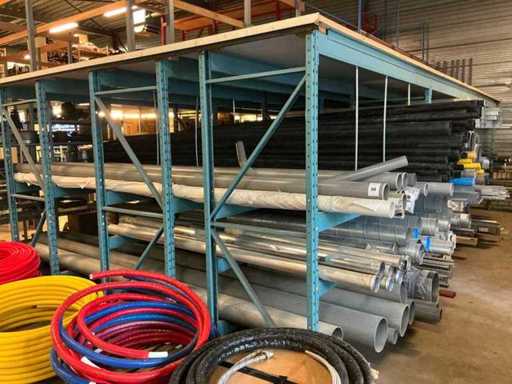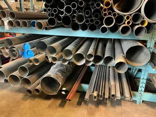 Der Inhalt des Racks besteht unter anderem aus verschiedenen PVC-Stücken bis etwa Ø 290 mm, Lüftungskanälen bis etwa Ø 310 mm und Kabelkanälen in verschiedenen Größen. Längen bis ungefähr: 5000 mm