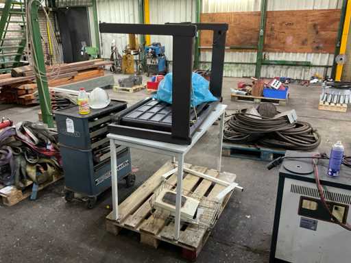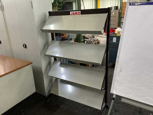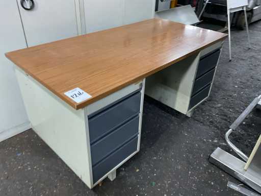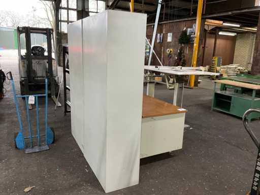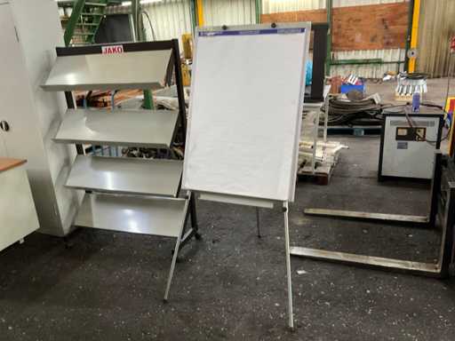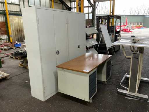 Bestehend aus: Schreibtisch (150x75x75 cm), 2x Aktenschrank (42x92x193 cm), Broschürenhalter, Flipboard, 2 Tische