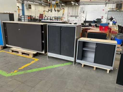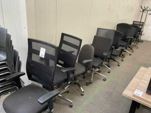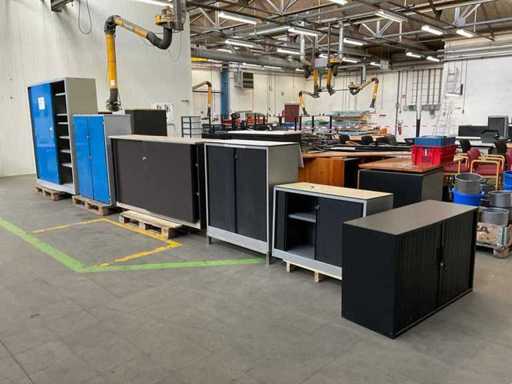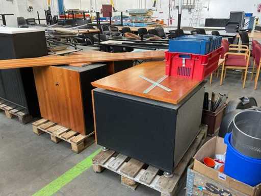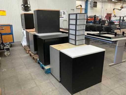 Verschiedene Büromöbel, bestehend aus: Schreibtische, Bürotische, Konferenzstühle, Schränke, Papiervernichter, Mülltonnen, Klappstühle, Garderobenständer usw.