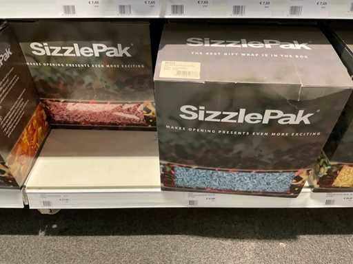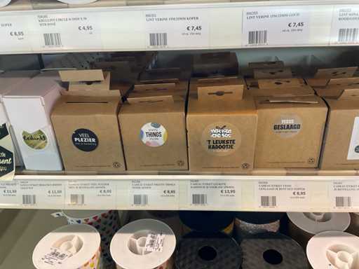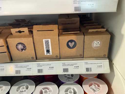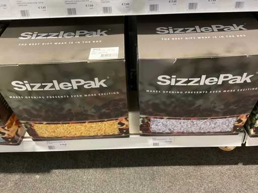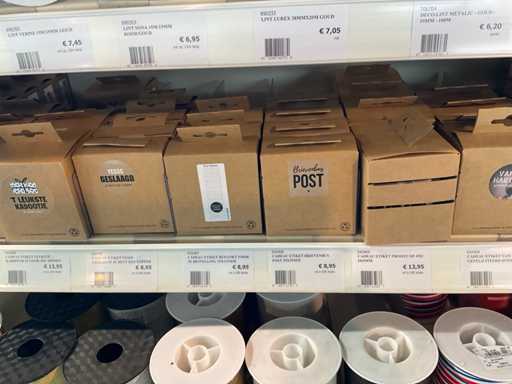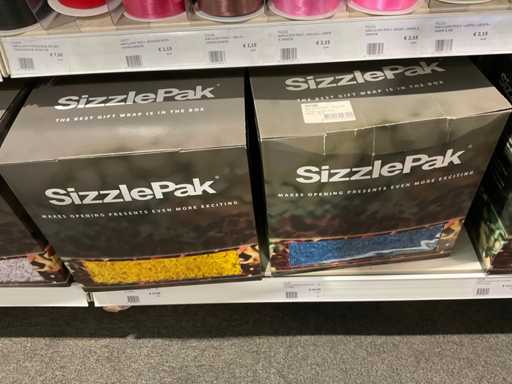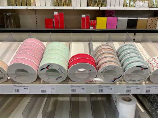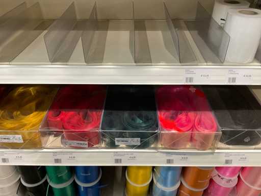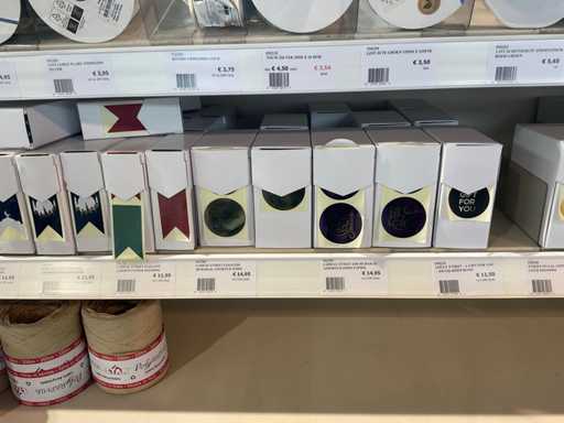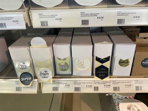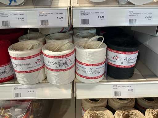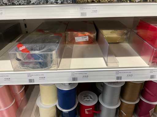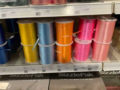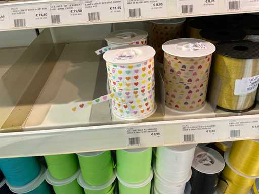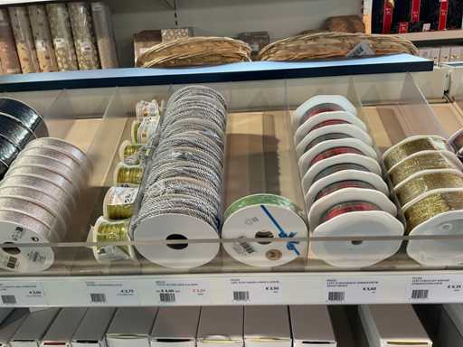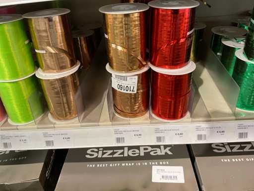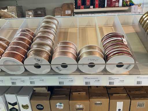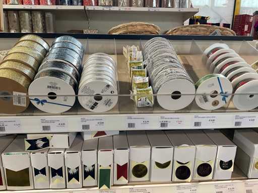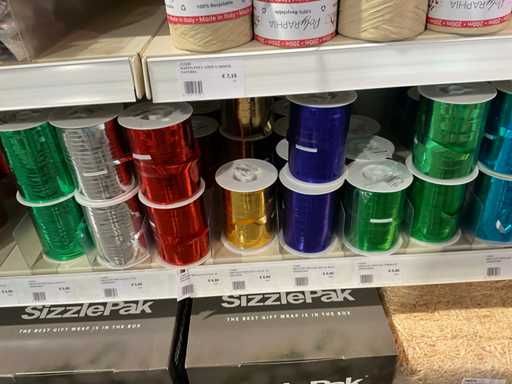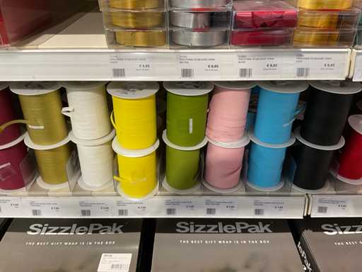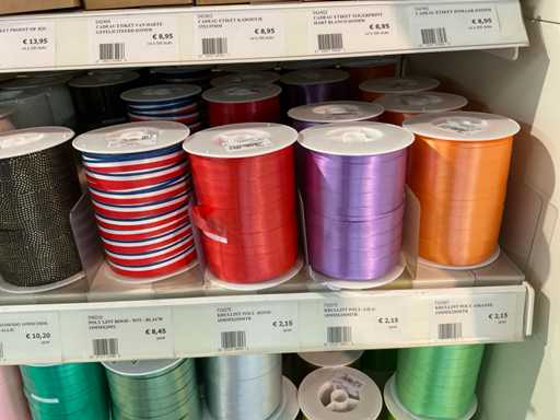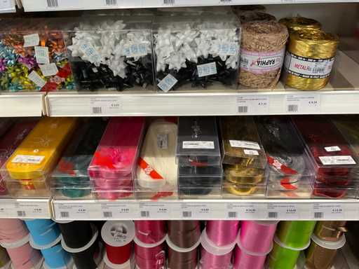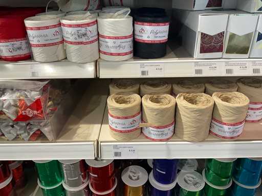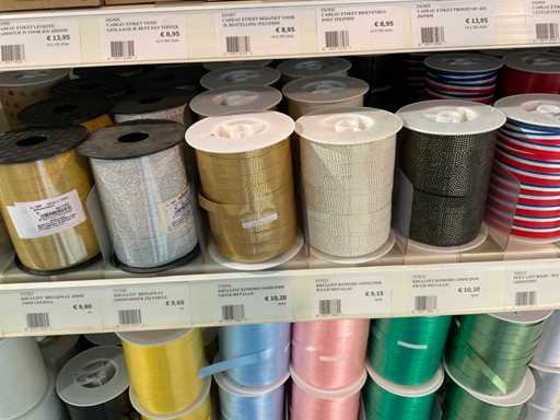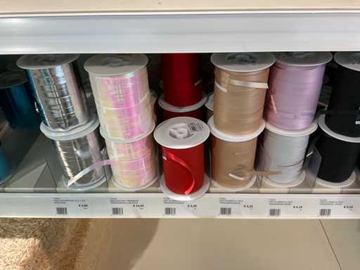 Inhalt einer Seite des Racks, bestehend aus Kordel, Seide-/Baumwollband, Lockenbändern, Sizzle, schnellen Schleifen, Raffia, Geschenketiketten, Geschenkgutscheinen. Ohne Rack.