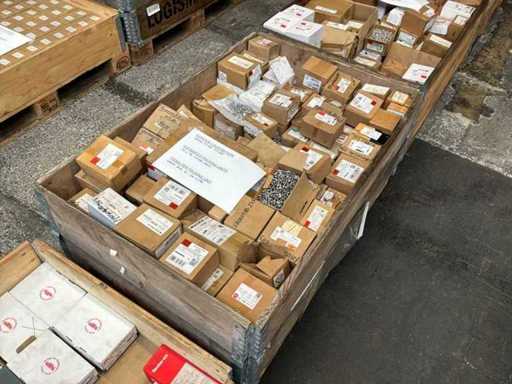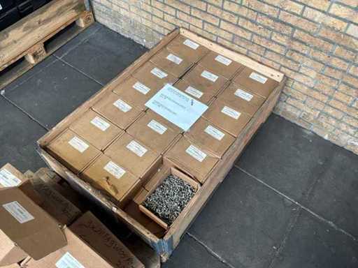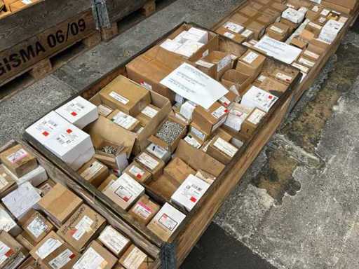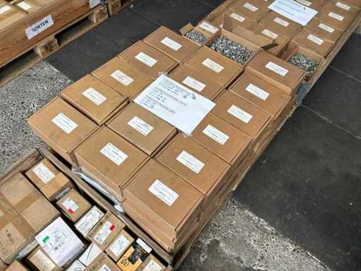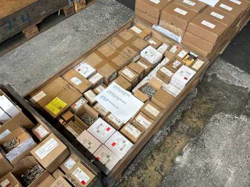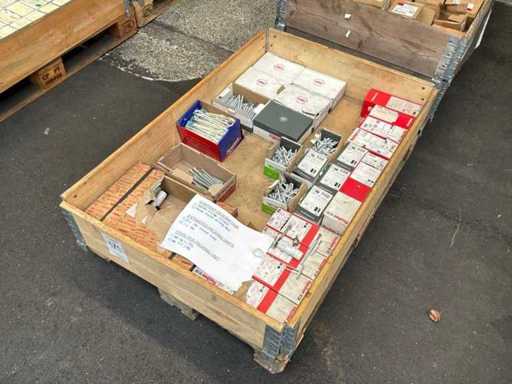 6 Paletten mit Installationsmaterial, bestehend aus: Schlagstopfen, Diamantkachelbohrer und verschiedenen Schraubengrößen.