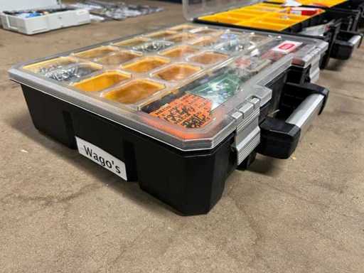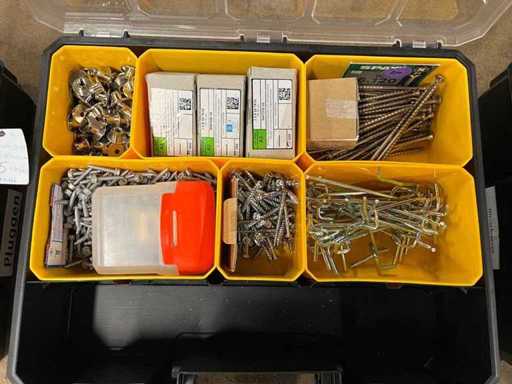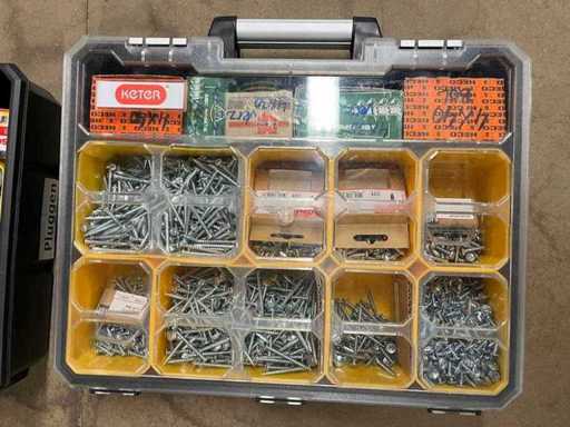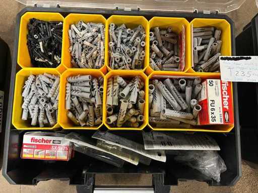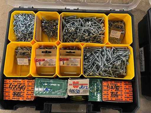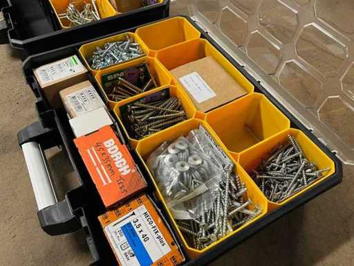 Charge von Schrauben und Kerzen in 4 Organizern (darunter Borgh, Heco, Fischer, Spax, Wago)