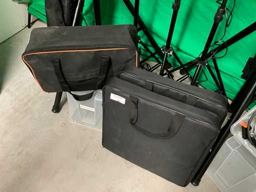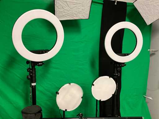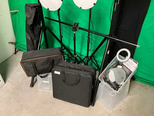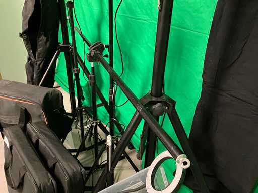 Bestehend aus grünem Hintergrund mit Stativen und Brücke; schwarzer Hintergrund; 3 Softboxen; 2 Ringlampen; 2 weiche Stellen; 2 Hochleistungsstative; 3 kleine Stative; 6x Abzugsklemme mit Zapfen; Schwelle; 7 Marktklemmen; Taschen und Spiegel