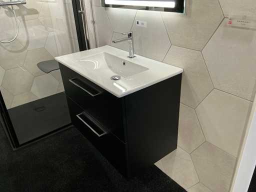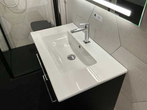 Bestehend aus einem Dansani-LED-Spiegel (80x70 cm), einem Bernstein-Waschbecken (81x45,5 cm) mit Christina Omega Waschbeckenwasserhahn, einem Bodenschrank (80x44x57,5 cm) mit 2 Schubladen.