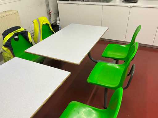 Ausgestattet mit Formica-Holzdecke, Metallsockel mit darauf montierten Kunststoffsitzen