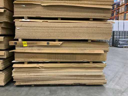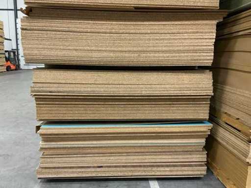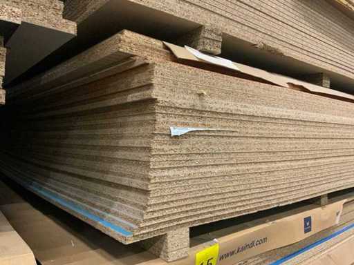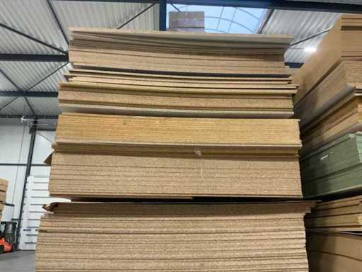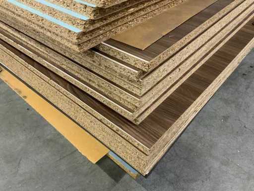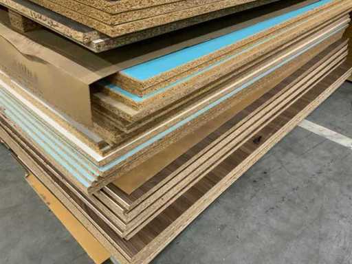 Die Platten sind etwa 2800x2070x18/28/38 mm groß; verschiedene Arten; Die Abmessungen können variieren; Dekorations-Spanplatten; einige doppelseitig laminiert; passt in 1 Tightliner; stapeln mit gelbem Aufkleber Nummer 15;