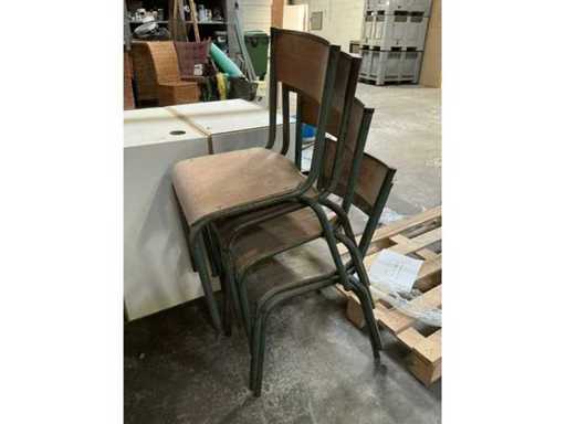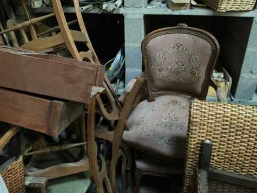 8 verschiedene klassische Holzseitenstühle, darunter antike Stoffpolster,